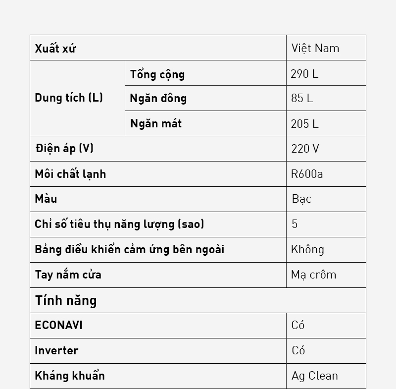 | Tiện ích | Lấy nước ngoài kháng khuẩn, Bảo quản thịt cá không cần rã đông, Inverter tiết kiệm điện, Lấy nước bên ngoài |